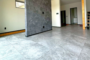 落ち着いた色味と広がりのある600角タイルで、モダンで開放的な空間に仕上げました。